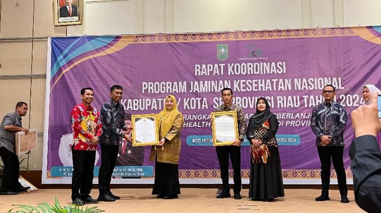 ROHIL, datariau.com - Bupati Rokan Hilir (Rohil) Afrizal Sintong SIP MSi dan Kepala Dinas Kesehatan Rohil, Ners Afrida SKep SKM MKes menerima penghargaan atas pencapaian jaminan kesehatan semesta/ Universal Health Coverage (UHC) dari Gubernur Provinsi Riau, Ir SF Hariyanto MT.