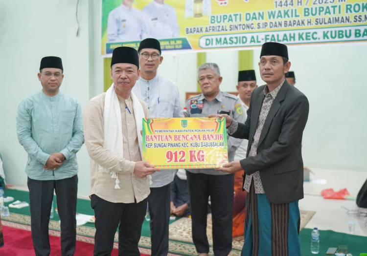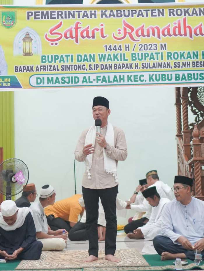 KUBA, datariau.com - Bupati Rokan Hilir, Afrizal Sintong SIP didampingi ketua PKK Rohil, Sanimar SPd melakukan Safari Ramadhan di Kecamatan Kubu dan Kubu Babussalam sekaligus, Selasa (11/4/2023) di Masjid Al Falah, Kepenghuluan Rantau Panjang Kiri, Kecamatan Kubu Babussalam.