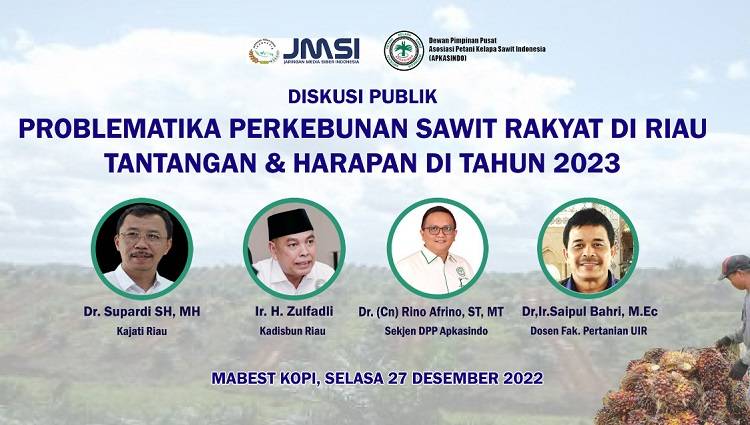 PEKANBARU, datariau.com - Perjalanan panjang industri sawit telah banyak menorehkan catatan. Untuk itu menutup akhir tahun 2022, Jaringan Media Siber Indonesia (JMSI) Provinsi Riau bersama Asosiasi Petani Kelapa Sawit Indonesia (APKASINDO) Riau mengadakan diskusi publik tentang persoalan dan tantangan serta potensi kelapa sawit rakyat di wilayah Riau pada Selasa (27/12/2022).