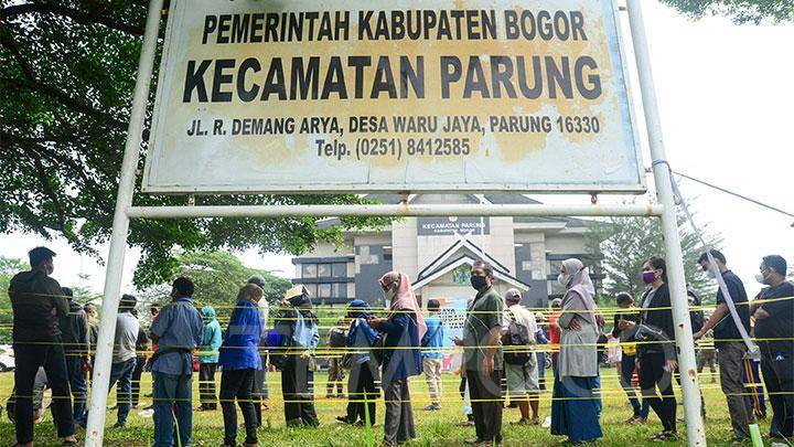 Antrean warga untuk mendapatkan vaksin dalam Vaksinasi Massal Covid-19 di lapangan parkir kantor Kecamatan Parung, Kabupaten Bogor, Rabu 14 Juli 2021. Sentra vaksinasi ini menetapkan target dua ribu warga per hari. TEMPO/Nurdiansah