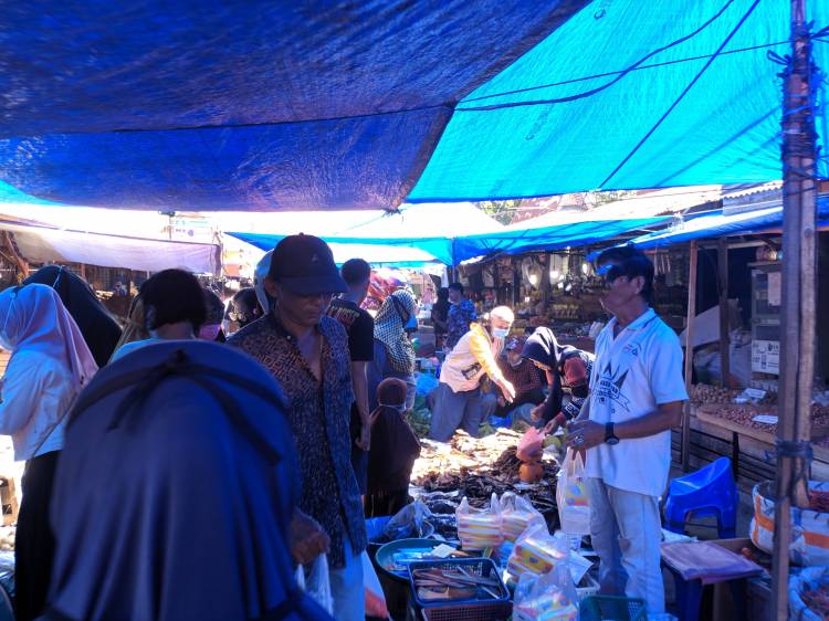 Pasar Selasa, Panam Pekanbaru, terlihat masih banyak masyarakat yang kurang peduli dengan protokol kesehatan.