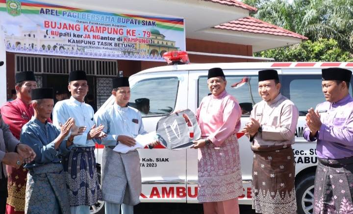 Bupati Siak Drs H Alfedri MSi serahkan unit ambulan di Kampung Tasik Betung.