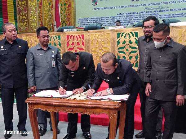 Ketua DPRD Kota Pekanbaru Muhammad Sabarudi ST dan Pj Walikota Muflihun melakukan penandatanganan persetujuan bersama tentang Ranperda Perubahan APBD 2022 menjadi Peraturan Daerah, Jumat (30/9/2022) malam.