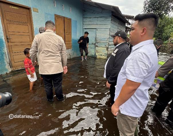 Wakil Ketua DPRD Kota Pekanbaru sekaligus Ketua Partai Gerindra Pekanbaru, Andry Saputra (jaket hitam) saat meninjau kondisi banjir di Rumbai.
