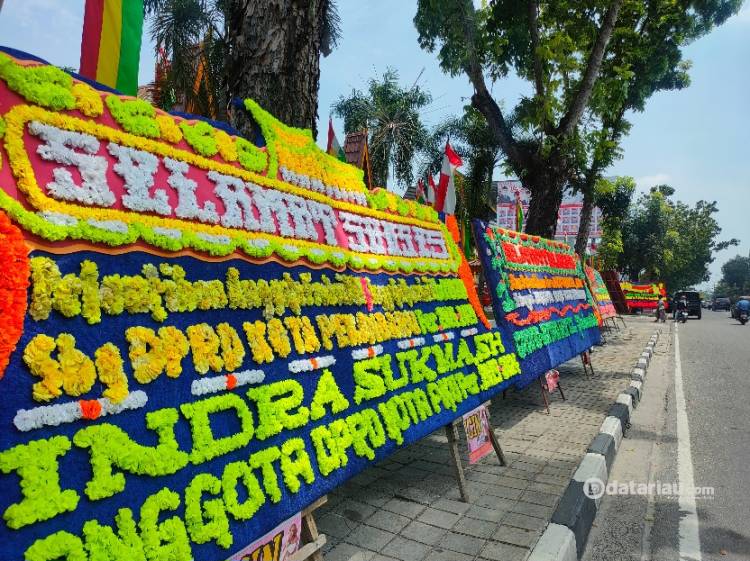 Tampak karangan bunga sudah membanjiri sekitaran Gedung Payung Sekaki DPRD Kota Pekanbaru jelang pelantikan anggota DPRD.