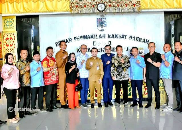 Pj Walikota Pekanbaru Risnandar Mahiwa foto bersama unsur pimpinan dan Anggota DPRD Kota Pekanbaru, saat berkunjung ke Gedung Payung Sekaki tersebut, Senin (27/5/2024).