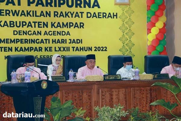BANGKINANG, datariau.com - DPRD Kabupaten Kampar menggelar rapat paripurna istimewa sempena Hari Jadi ke-72 Kabupaten Kampar tahun 2022, di ruang rapat paripurna DPRD Kampar, Ahad (6/2/2022).