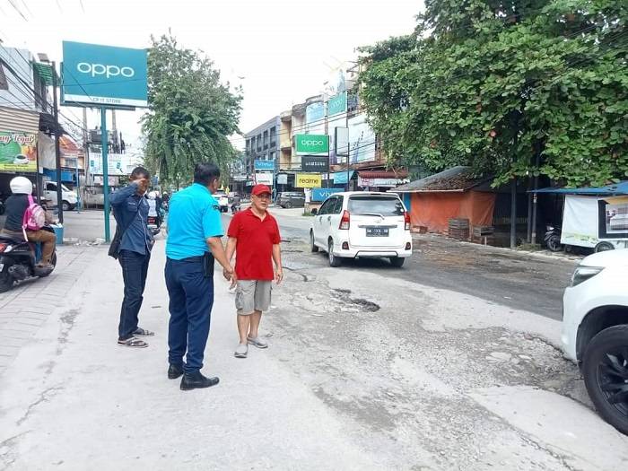Ketua Komisi I DPRD Pekanbaru Doni Saputra SH MH saat meninjau kondisi jalan yang rusak akibat bekas galian pipa.
