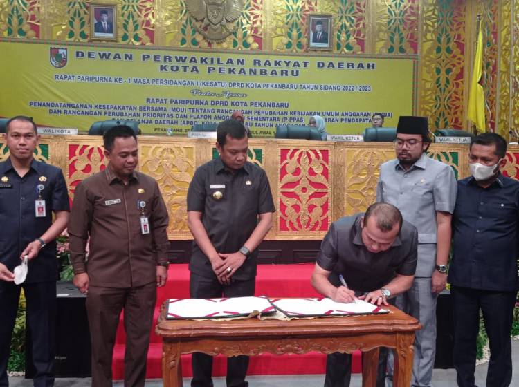 Ketua DPRD Pekanbaru Muhammad Sabarudi ST saat menandatangani berita acara MoU KUA-PPAS APBD-P tahun anggaran 2022.
