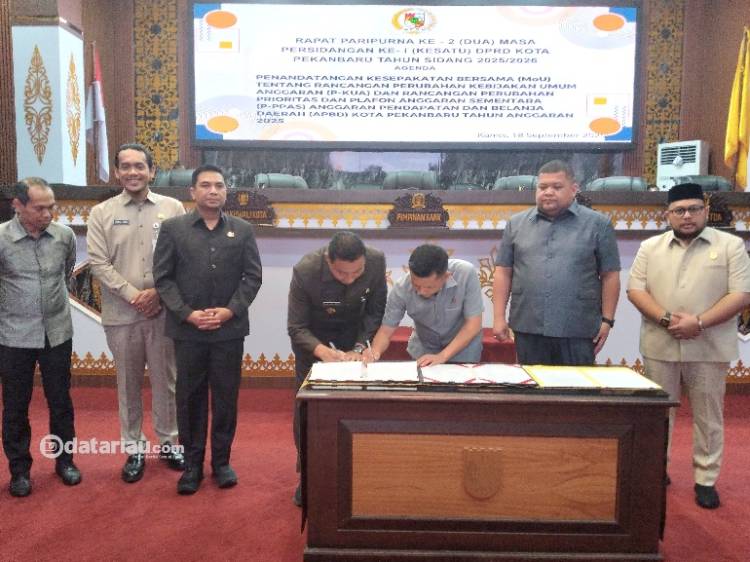 Penandatanganan dilakukan oleh Wakil Walikota Pekanbaru Markarius Anwar, Wakil Ketua DPRD Pekanbaru Tengku Azwendi Fajri, M Dikky Suryadi Khusaini dan Andry Saputra.