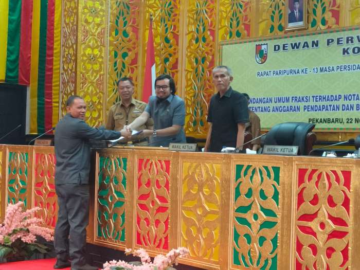 Sebanyak 7 Fraksi di DPRD Kota Pekanbaru, secara bergantian menyampaikan pandangan umum fraksi terhadap nota keuangan dan Ranperda APBD Kota Pekanbaru TA 2023.