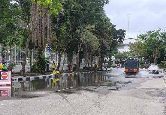 Presiden Datang, Banjir di Sekitaran Kantor Gubernur Riau Dijaga Pasukan Kebersihan