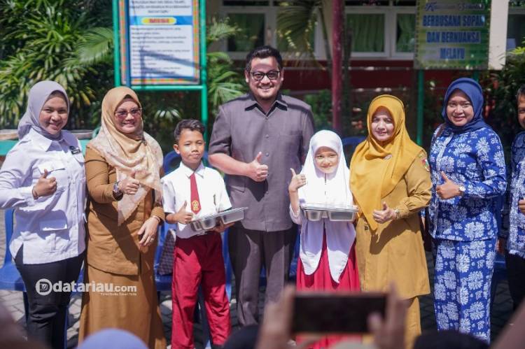 Rizky Bagus Oka ikut menyaksikan pemberian pertama program MBG di SDN 076 dan SDN 043, Kecamatan Bukit Raya, Senin (15/9/2025).
