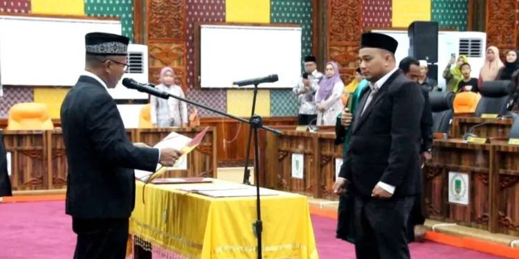 ROHIL, datariau.com - Dewan Perwakilan Rakyat Daerah atau DPRD Kabupaten Rokan Hilir menggelar sidang paripurna dalam rangka peresmian pemberhentian anggota DPRD Rokan Hilir atas nama Muhammad Firdaus NZ SSos MIP dan peresmian pengangkatan anggota DPRD pengganti antar waktu anggota DPRD Kabupaten Rokan Hilir atas nama Syahrul Alfindra SPd masa jabatan 2019-2024.