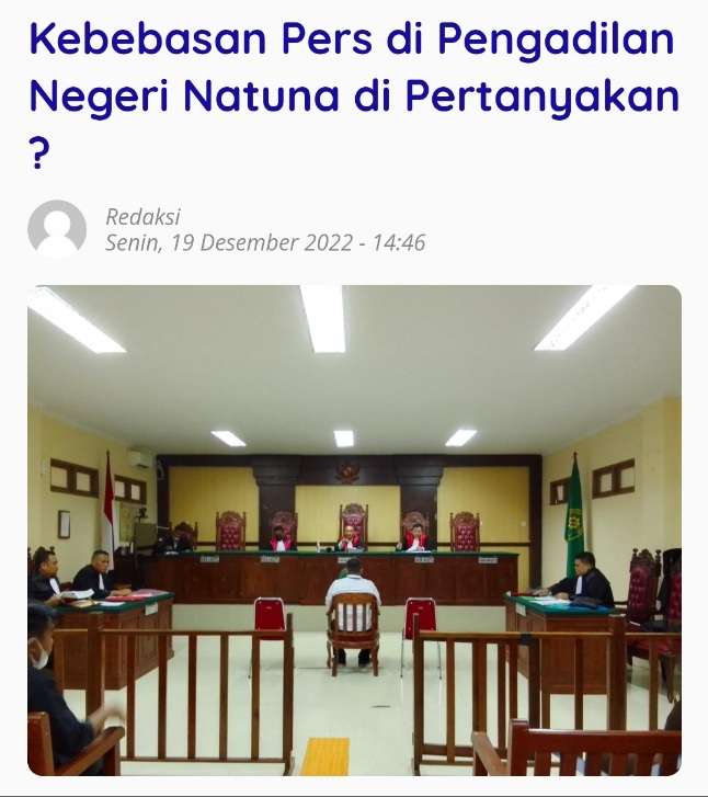 "Saya selaku penanggung jawab media online Alreinamedia tentunya sudah memiliki dasar akan pemberitaan yang telah kami terbitkan, sebab di dalam persidang tersebut kami ada di dalam persidangan dan persidangan pun terbuka untuk umum. Jadi tidak mungkin kami konfirmasi lagi apa yang kami tulis, sebab fakta-fakta di persidangan saat kami mengambil gambar, cara teguran Kepala Pengadilan Negeri Natuna kami anggap telah aragon di hadapan para jaksa, terdakwa, penasehat hukum serta masyarakat yang hadir di persidangan," kata Ari.
