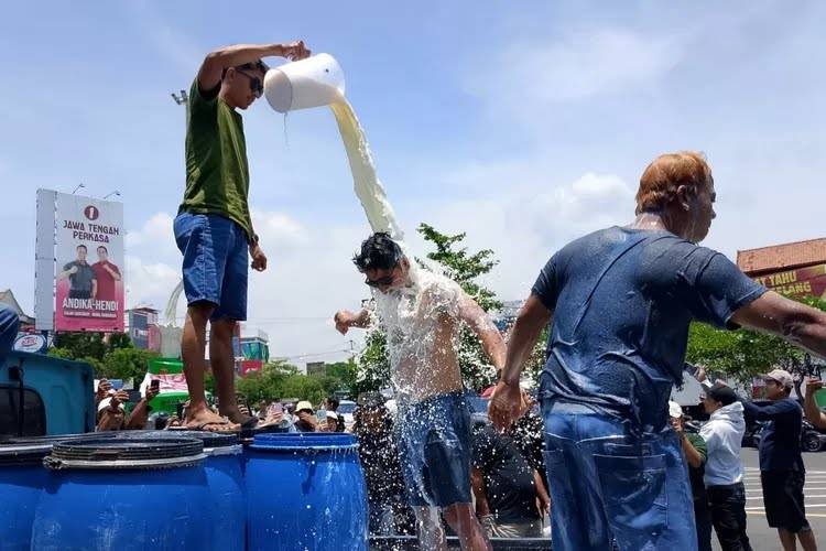 Ratusan peternak sapi perah, peloper dan pengepul susu sapi di Kabupaten Boyolali Jawa Tengah menggelar aksi membuang susu untuk mandi di Tugu Patung Susu Tumpah Kota Boyolali pada Sabtu (9/11/2024). Aksi ini merupakan bentuk protes mereka karena banyaknya susu yang ditolak masuk Industri Pengolahan Susu (IPS) dengan dalih adanya pembatasan masuk susu mentah ke pabrik.