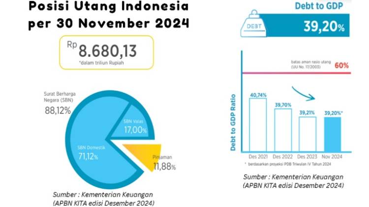 Berdasarkan posisi utang per november 2024 terdapat 71,12% atau setara Rp 7.648,87 Tiliun penerbitan SBN Domestik (Rp 6.173,37 Triliun ) dengan pembagian Surat Utang Negara sebesar Rp 4.979,64 Triliun dan Surat berharga Syariah negara sebanyak Rp 1.193,73 Triliun sedangkan SBN Valas terdata 17,00% (dalam bentuk mata uang asing) senilai Rp 1.472,50 Triliun serta terbagi dalam bentuk Surat Utang Negara Rp 1.082,67 Triliun dan Surat Berharga Syariah Negara yang bernilai Rp 392,83 Triliun. Pinjaman pemerintah tercatat 11,88% terbagi menjadi Rp 42,88 Triliun Pinjaman Dalam Negeri kemudian Pinjaman Luar Negeri Rp 988,38 Triliun.