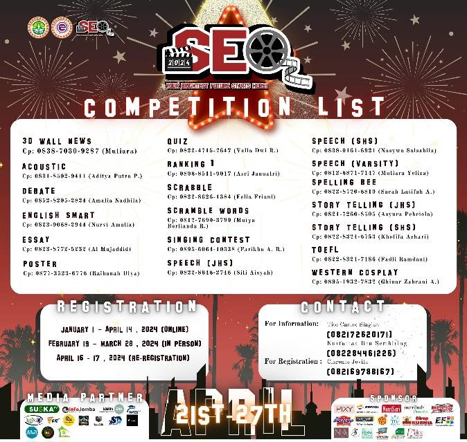Dikemas dengan nuansa Hollywood, SEO 2024 hadir dengan tema “Your Brightest Future Starts Here!” sebagai ajakan bagi para peserta untuk mengejar masa depan yang gemilang. Olimpiade ini dirancang untuk tidak hanya meningkatkan kemampuan berbahasa Inggris, tetapi juga untuk membentuk sumber daya manusia yang kompeten dan mempromosikan penggunaan Bahasa lnggris di lingkungan sekolah, universitas, dan masyarakat luas.