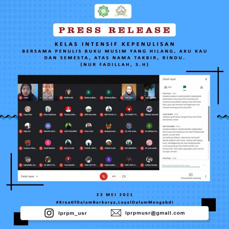 Kelas intensif yang diadakan oleh Lembaga Pengembangan Riset dan Pengabdian Masyarakat UIN SUSKA Riau atau biasa di kenal dengan LPRPM UIN SUSKA Riau itu medapatkan antusias yang sangat luar biasa dari para peserta. Hal itu dapat di lihat dari jumlah peserta yang hadir berkisar lebih dari 50 orang dan juga tidak hanya kalangan mahasiswa UIN SUSKA Riau saja yang menghadiri acara tersebut. Ada juga mahasiswa UIN Syarif Hidayatullah Jakarta dan UIN Jambi. Acara yang diselenggarakan oleh LPRPM atau Lembaga Pengembangan Riset dan Pengabdian Masyarakat tersebut membahas hal-hal yang berkenaan dengan kepenulisan. LPRPM UIN SUSKA RIAU menghadirkan narasumber Nur Fadillah, S.H. selaku alumni UIN SUSKA RIAU pada Program Studi Hukum Tata Negara Siyasah Guna berbagi ilmu, tips, dan trik dalam menulis. Nur Fadillah merupakan seorang penulis dari tiga buah buku yang berjudul: Musim Yang Hilang, Atas Nama Takdir dan Aku Kau dan Semesta