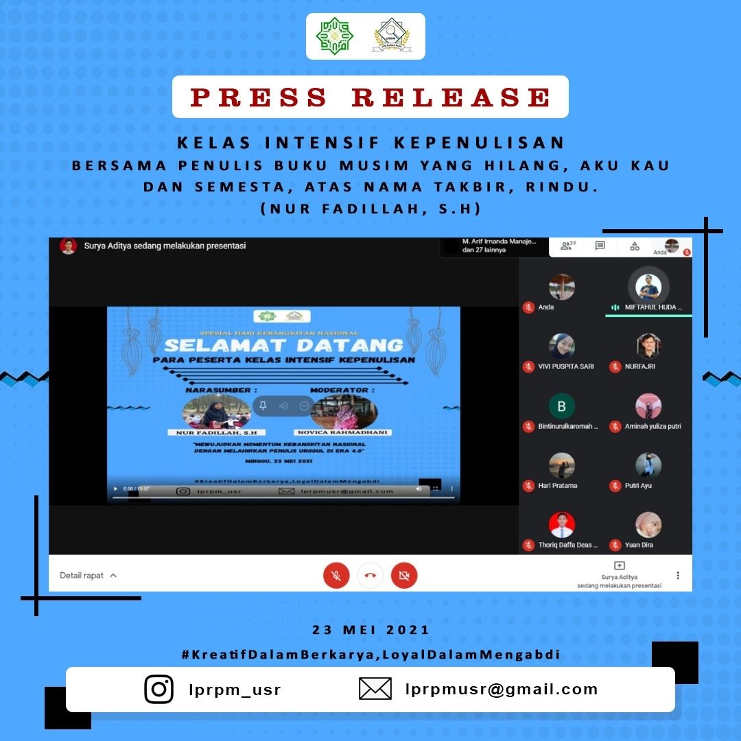 Acara tersebut diadakan oleh LPRPM UIN SUSKA Riau pada hari Minggu, 23 Mei 2021 va Google Meet pada pukul 09:00 WIB dengan mengusung tema seputar hari kebangkitan nasional yang diharapkan dapat menjadi penyemangat para peserta dalam bidang kepenulisan di era 4.0. selain itu juga Nurfajri yang merupakan ketua pelaksana acara ini menyampaikan bahwa acara tersebut diadakan untuk melatih peserta di mana saat ini dunia kepenulisan sedang naik daun. Oleh karenanya dengan perkembangan zzaman yang semakin canggih juga di butuhkan penulis-penulis professional untuk mewarnai kehidupan di era 4.0. hal itu senada dengan apa yang di utarakan MIftahul Huda yang merupakan ketua umum LPRPM 2021-2022 yang dalam kata sambtannya mengharapkan bahwa momentum hari kebangkitan nasional haruslah di isi dengan prestasi dan kelebihan di dunia keilmuwan. Kalau dahulu pejuang bangsa berjuang dengan senjata. Maka hari ini kita berjuang dengan ilmu dan pena yang kita miliki masing-masing.