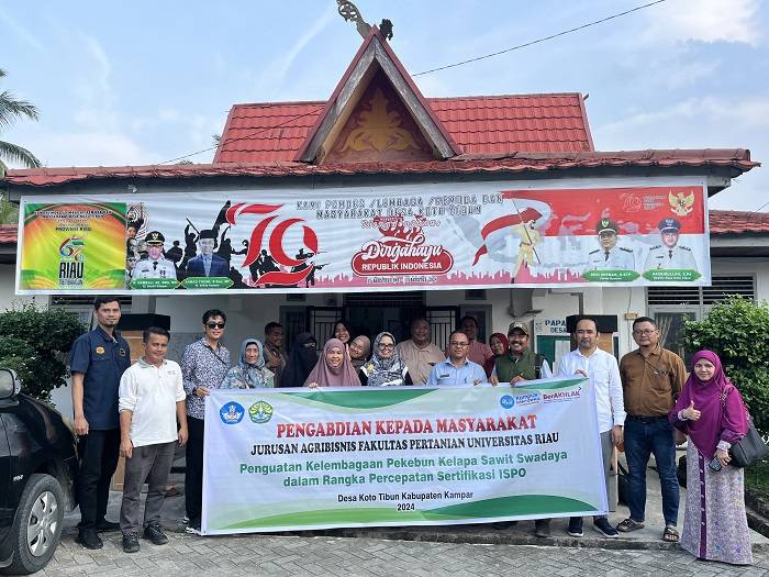 KAMPAR, datariau.com - Pengabdian masyarakat dengan tema “Penguatan Kelembagaan Pekebun Kelapa Sawit Swadaya dalam Rangka Percepatan Sertifikasi ISPO” berlangsung sukses di Kantor Desa Koto Tibun, Kecamatan Kampar, Kabupaten Kampar.