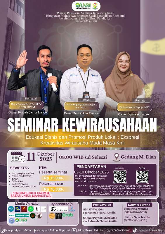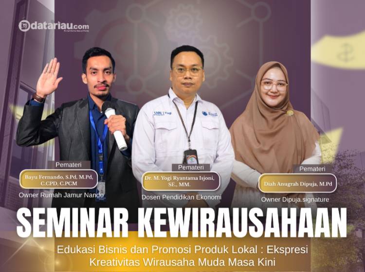 Seminar ini menghadirkan tiga narasumber inspiratif dari kalangan akademisi dan praktisi bisnis. Dr M Yogi Ryantama Ijoni SE MM, Dosen Pendidikan Ekonomi FKIP UNRI, mengajak mahasiswa memanfaatkan lingkungan kampus sebagai wadah berinovasi dan berkolaborasi untuk menciptakan ide-ide bisnis yang kreatif dan beretika. Dua narasumber berikutnya berasal dari kalangan wirausaha muda sukses, yaitu Bayu Fernando SPd MPd CCPD CPCM (Owner Rumah Jamur Nando) dan Diah Anugrah Dipuja MPd (Owner Dipuja.Signature). Mereka akan membagikan pengalaman dan kiat sukses dalam membangun bisnis lokal yang inovatif. Kedua pemateri ini akan menekankan pentingnya keberanian mengambil risiko, berpikir kreatif, dan beradaptasi dengan perubahan zaman dalam mengembangkan usaha.
