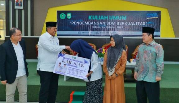 Sebelum memberi kuliah umum, Bupati Siak Drs H Alfedri MSi menyerahkan beasiswa secara simbolis kepada mahasiswa penerima beasiswa pendidikan dari Pemerintah Kabupaten Siak.