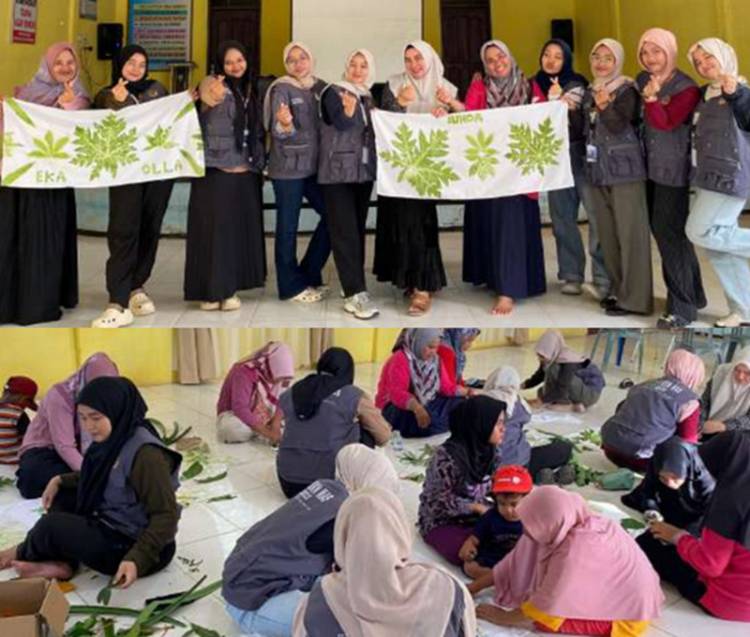 Ibu-ibu PKK Kampung Olak mengikuti praktik Ecoprint bersama mahasiswa KKN MAS pada Kamis (21/8/2025).