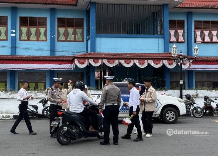 Mahasiswa KKN MAs kelompok 2 Kampung Dalam, Kecamatan Siak bersama dengan jajaran Polsek Siak melaksanakan kegiatan pembagian bendera, Kamis (16/1/2025).