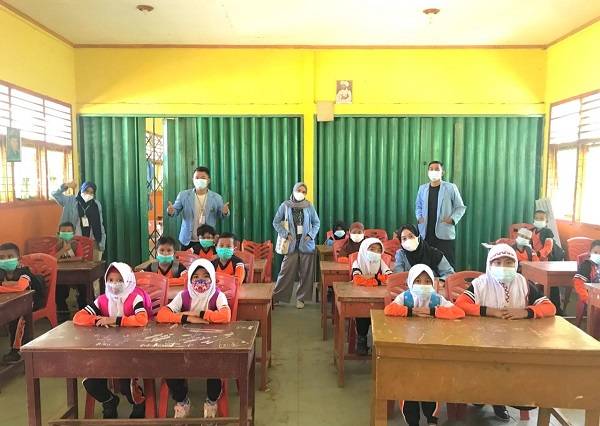 Dalam kegiatan tersebut, Irvi bersama tim mengenalkan protokol kesehatan ke siswa-siswi SDN 001 Desa Buluh Cina.