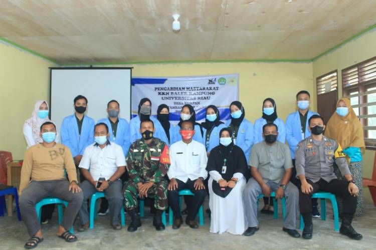 Mahasiswa kukerta Unri foto bersama dengan aparat TNI-Polri dan perangkat desa.