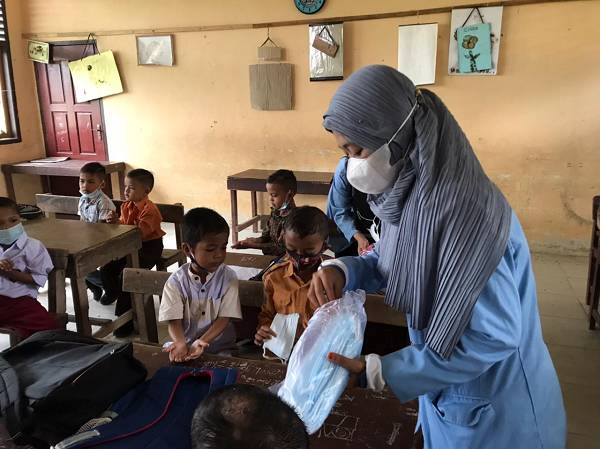 Mahasiswa Kukerta UNRI 2021 Desa Koto Perambahan Bagikan Masker dan Hand Sanitizer Serta Edukasi Tentang Covid-19 di SDN 005