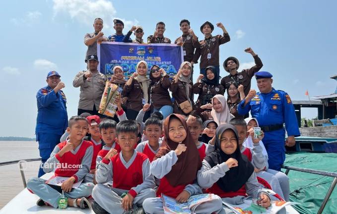 Para siswa diajak berpetualang ilmu di atas air, tepatnya di Perpustakaan Terapung atau Kapal Baca milik Satpol Airud Polres Indragiri Hilir.