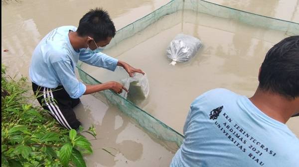 Mahasiswa Kukerta UNRI Bagikan Bibit Ikan Patin Kepada Kelompok Pembudidaya Ikan di Tangkerang Utara
