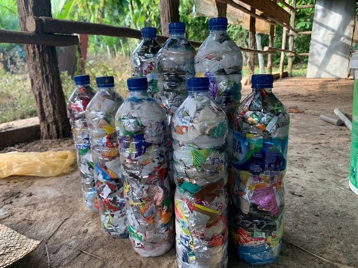 Sampah plastik yang sudah diolah menjadi ecobrick oleh Mahasiswa Kukerta UNRI akan disusun menjadi objek spot foto terbaru Sungai Subayang.