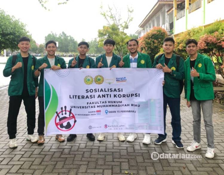 Mahasiswa Universitas Muhammadiyah Riau melakukan sosialisasi anti korupsi pada siswa SMA Negeri 15 Pekanbaru, Kamis (22/11/2024) sore.