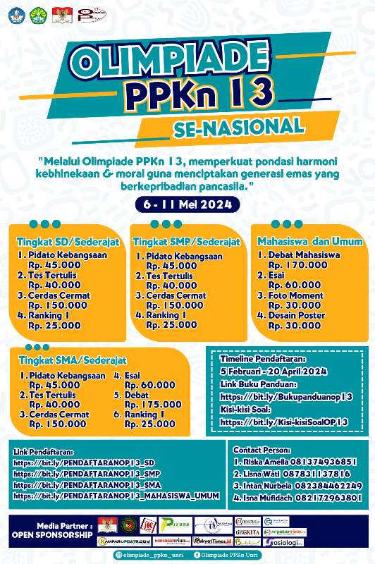 Bagi seluruh Sekolah dan juga Universitas yang ingin mendaftarkan dan belum mendapatkan Surat Undangan Olimpiade PPKn 13 Universitas Riau bisa menghubungi Contact Person Riska Amelia 081374946851, Lisna Wati 087831137816, Intan Nurbela 082384462249, dan Isna Mufidach 082172963801.