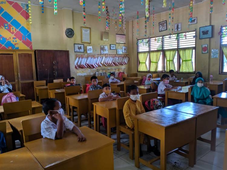 Siswa SDN 37 Pekanbaru melakukan belajar tatap muka dengan prokes ketat.