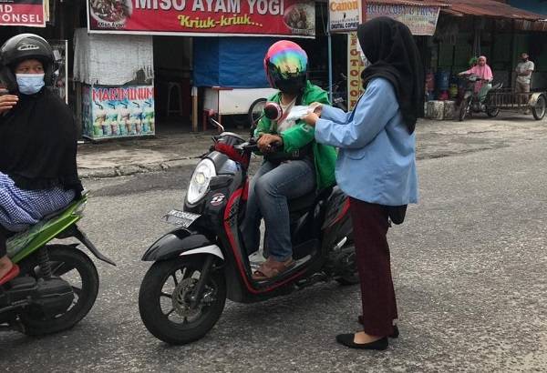 Pengabdian Mahasiswa Kukerta UNRI Bagikan Hand Sanitizer dan Masker Untuk Driver Online dan UMKM di Kelurahan Sukamaju