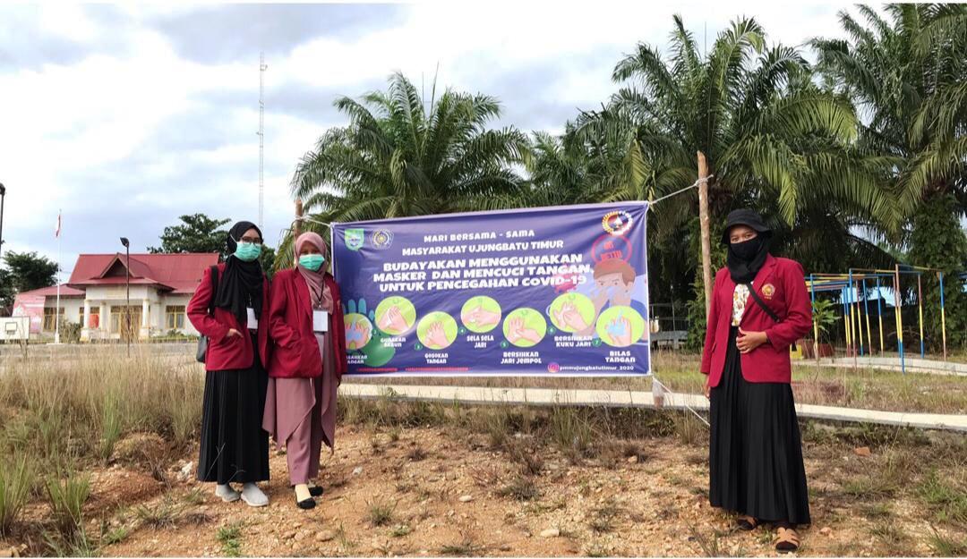 PMM-UMM Kelompok Pasang Banner Untuk Mengajak Warga Desa Ujungbatu Timur Jalankan Protokol Kesehatan