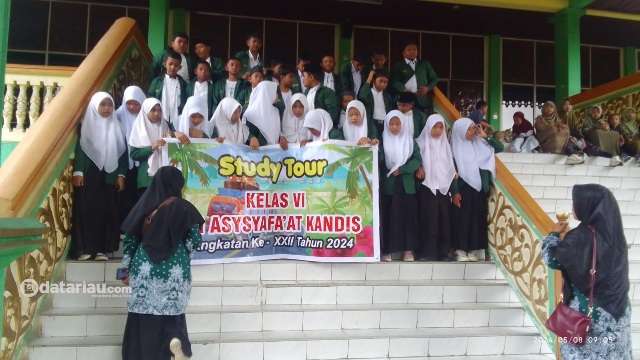 Puluhan pelajar kelas VI MI Asysyafa'at Kandis Kabupaten Siak Sri Indrapura foto bersama di Museum Sang Nila Utama Provinsi Riau dalam rangka Study Tour, Rabu (8/5/2024).