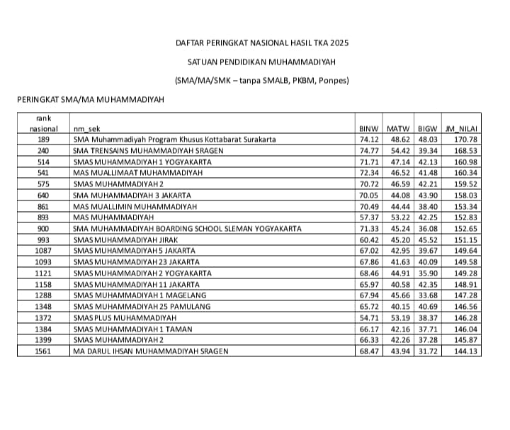 DATARIAU.COM - SMA Muhammadiyah 1 Yogyakarta kembali menorehkan prestasi membanggakan di tingkat nasional. Pada tahun 2025, sekolah ini berhasil meraih peringkat 3 nasional berdasarkan hasil Tes Kemampuan Akademik (TKA) untuk jenjang SMA/MA Muhammadiyah se-Indonesia.
