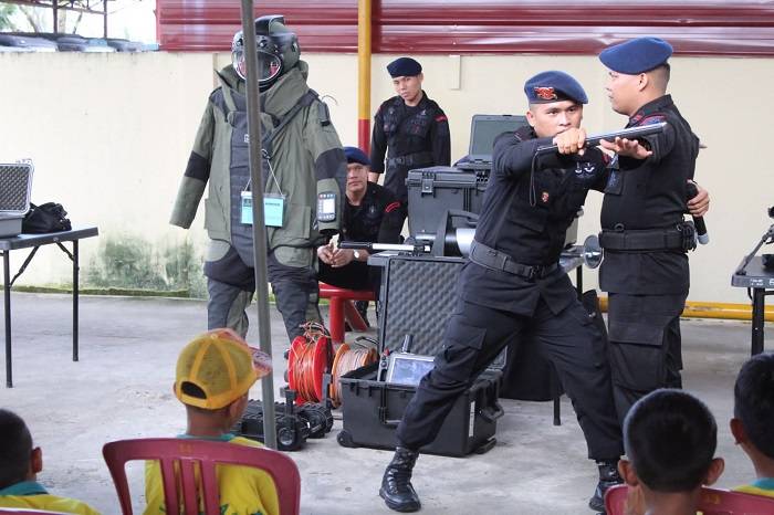 Sat Brimob Polda Riau saat memperkenalkan tugas dan alat-alat Brimob Polri kepada peserta didik SDIT Al Fath, dalam kunjungan di Brimob Polda Riau, Kamis (2/3/2023).