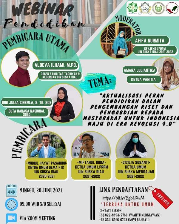 PEKANBARU, datariau.com - Tiga lembaga kemahasiswaan UIN Suska Riau berkolaborasi menaja webinar pendidikan dengan tema ?Aktualisasi Peran Pendidikan dalam Pengembangan Riset dan Pengabdian Masyarakat Untuk Indonesia Maju di Era Revolusi 4.0?, Ahad (20/6/2021).