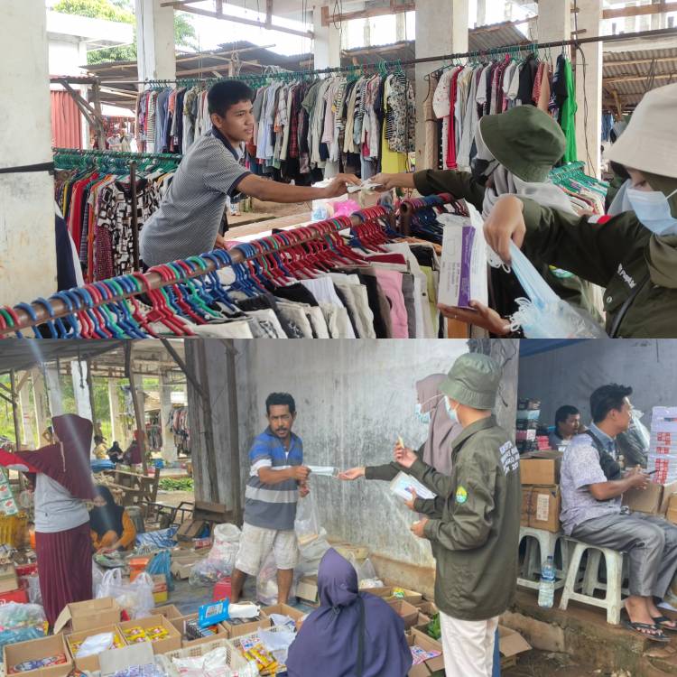 Kegiatan ini dilakukan sebagai salah satu upaya guna memutus mata rantai penyebaran covid-19 di kawasan yang ramai pengunjung salah satunya yaitu pasar Kamis Desa Bangko Jaya. Sehingga tim KUKERTA melakukan sosialisasi tentang bahayanya Covid-19 ini dan juga melakukan pembagian masker kepada pedagang dan juga pengunjung yang tidak mengenakan masker didaerah pasar tersebut.