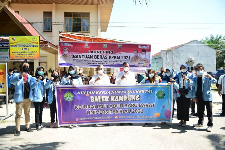 Tim Kukerta Unri Desa Labuh Baru Barat Ikut Serta Dalam Penyerahan Beras PPKM Oleh Gubernur Riau