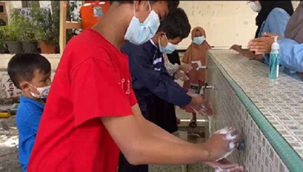 Selanjutnya, mempraktekkan dan menjelaskan bagaimana cara mencuci tangan yang baik dan benar. Seperti yang diketahui, mencuci tangan yang baik dan menar menurut WHO adalah basahi tangan seluruhnya dengan air bersih mengalir, lalu tuangkan sabun ke seluruh bagian tangan, kemudian gosok sabun ke telapak tangan, punggung tangan, dan sela-sela jari setidaknya selama 20 detik, bilas tangan dengan air bersih mengalir.