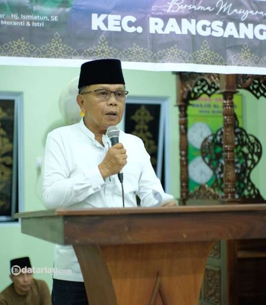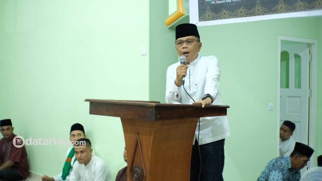 H Asmar saat menyampaikan pidato dalam safari ramadan 1455 H di Masjid Al Jihad Desa Bungur Kecamatan Rangsang Pesisir, Ahad (24/3/2024).