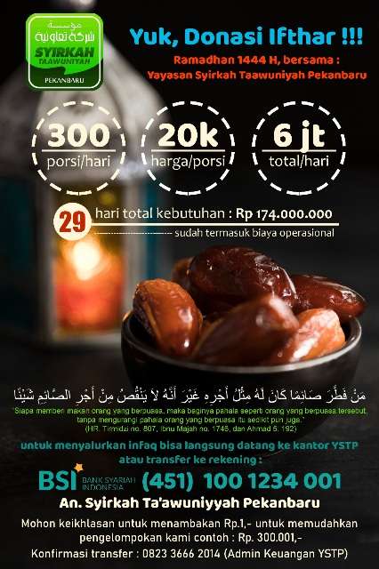 Bagi yang berinfak makanan dan minum untuk berbuka silahkan antar ke kantor YSTP sebelum Shalat Asar setiap harinya selama Ramadhan.