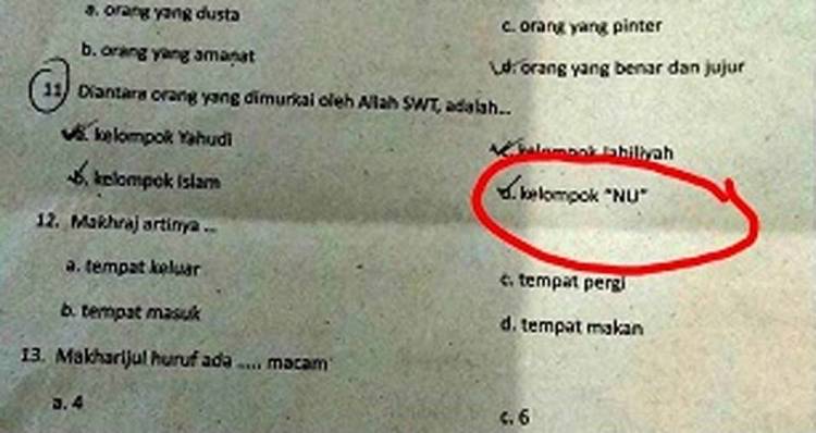 Viral Soal Ujian Sekolah, Kelompok NU Masuk Pilihan Jawaban Orang Dimurkai Allah